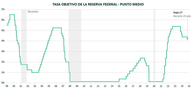 Esta semana se llevó a cabo una de las reuniones de la Reserva Federal más esperadas, aunque con resultados ampliamente descontados. El FOMC entregó lo esperado: un recorte de 25 puntos básicos que sitúa la tasa de referencia en el rango de 4,00-4,25%, marcando el primer ajuste a la baja en nueve meses.