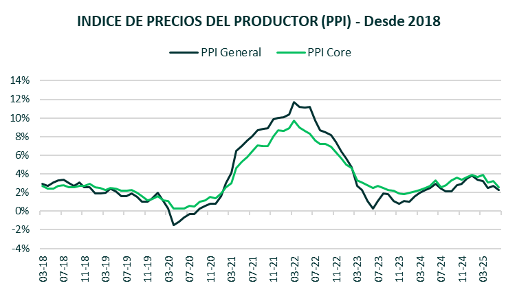 Índice de Precios al Productor: El IPP se mantuvo estable en junio, sorprendiendo al consenso que estimaba un incremento del 0,2%. La Oficina de Estadísticas Laborales reportó que el dato para la demanda final total no registró cambios mensuales, contrastando con el aumento revisado del 0,3% de mayo. En términos interanuales, el IPP creció 2,3%, moderándose desde el 2,7% del período anterior y presentando el nivel más bajo desde septiembre de 2024.