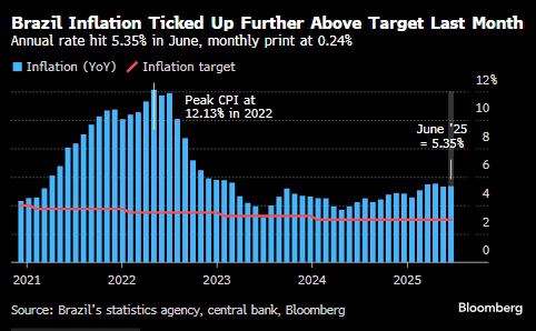 La inflación anual alcanzó el 5,35% en junio, superando las estimaciones de 5,30% y manteniéndose por encima del objetivo del Banco Central por sexto mes consecutivo. La inflación mensual se situó en 0,24%, reflejando una ligera desaceleración respecto a meses anteriores, aunque el índice de precios en la principal economía latinoamericana continúa fuera del rango máximo establecido.