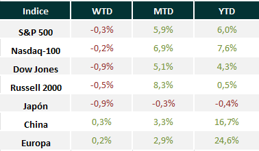 En el mercado de renta fija, el rendimiento del bono del Tesoro a 10 años escaló hasta cerca del 4,42% al cierre, y el índice del dólar se apreció ligeramente, al igual que el oro y el crudo que subieron con más fuerza. Por otro lado, las acciones europeas y la mayoría de los índices asiáticos —con la excepción de China— terminaron la sesión en rojo.